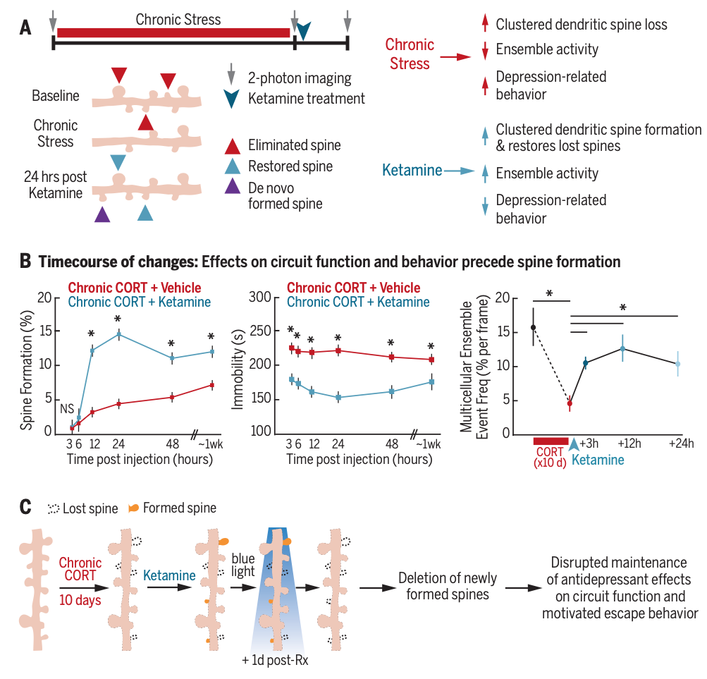 Depression is a fundamentally episodic psychiatric disorder defined by periods of low mood interposed between periods of wellness, but the mechanisms that drive mood state transitions over time are not well understood. I will present findings from a series of parallel studies in preclinical mouse models and in patients with depression aimed at identifying cellular and circuit-level mechanisms that initiate and sustain mood state switches. Through repeated longitudinal imaging of medial prefrontal microcircuits in the living brain, we found that synaptogenesis in prefrontal cortical projection neurons plays a critical role in sustaining specific antidepressant behavioral effects and maintaining long-term behavioral remission after ketamine treatment. Depression-related behavior was associated with targeted, branch-specific elimination of postsynaptic dendritic spines. Antidepressant-dose ketamine reversed these effects by selectively rescuing eliminated spines and restoring coordinated activity in multicellular ensembles within the anterior cingulate, which support effortful reward-seeking behavior through projections to the nucleus accumbens. Prefrontal synaptogenesis was required for the long-term maintenance of antidepressant effects on behavior but not for their initial induction, which was driven in part by hyperpolarizing somatostatin interneurons and disinhibiting projection neurons.