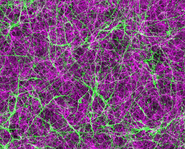 Cortical interneurons establish a broad, distributed network of local inhibitory circuits. However, because interneuron synapses are so numerous and widespread, new tools needed to be developed that provide high-content information for each synapse beyond standard metrics (size, shape, etc.), while also assessing overall interneuron synaptic coverage. To meet both of these requirements, we recently developed a novel image-based machine learning method to analyze cortical interneuron synapses at scale, an approach we term Synaptic Subtype IDentification (SSID). Using SSID, we extract hundreds of spatial and intensity features from each synapse imaged, thereby generating a high content, quantitative, deep phenotyping read-out of interneuron synaptic state across conditions. This rich dataset allows us to 1) Identify previously unrecognized synaptic subgroups; 2) Quantify each synaptic subgroup’s relative representation in the whole population; 3) Determine the spatial distribution of synaptic subgroups within large regions of interest (eg. within a cortical column). In our preliminary data, we show that applying SSID to a FXS mouse model identifies deficits in both the relative representation of synaptic subgroups, as well as the spatial arrangement of interneuron synapses. However, we expect that FXS will manifest differently between mice and humans. Therefore, we have developed a strategy to use SSID to directly compare synaptic effects of FXS across cognate mouse and human interneurons. To model FXS in interneurons, we developed a rapid and highly efficient direct reprogramming system to generate human induced neurons (iiNs) from iPSCs using transcription factors (TFs). This approach, which stands in contrast to traditional extrinsic factor-driven directed differentiation, offers several key advantages. Our collaborators established high-efficiency, inducible iPSC-iiN cell lines where the reprogramming TFs are inserted into the genome via piggyBac (PB) transposons. These constructs are finely controlled, with each TF driven by a doxycycline-inducible promoter (TRE), alongside the necessary doxycycline-dependent TF (rTTA). This precise control is enables us to generate iiNs of defined cell lineages with up to 95% efficiency, with level of maturity comparable to those of cultured endogenous mouse cortical neurons.